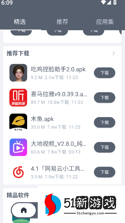 1、首页推荐的软件包括吃鸡捏脸助手、喜马拉雅、木鱼等,覆盖娱乐和工具类别,便于用户快速找到并获取常用应用。
