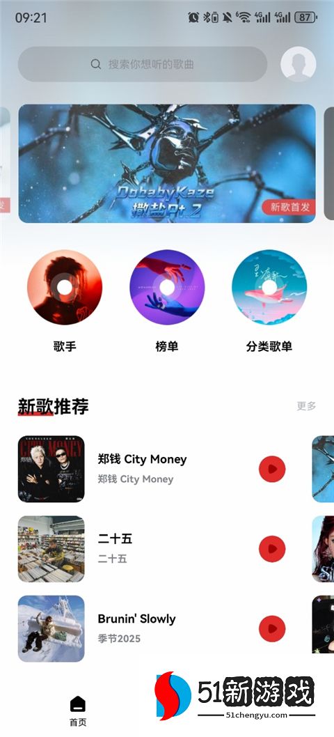 1、用户进入界面时,可以在页面上预览新歌和搜索歌曲,下面有推荐的歌手。