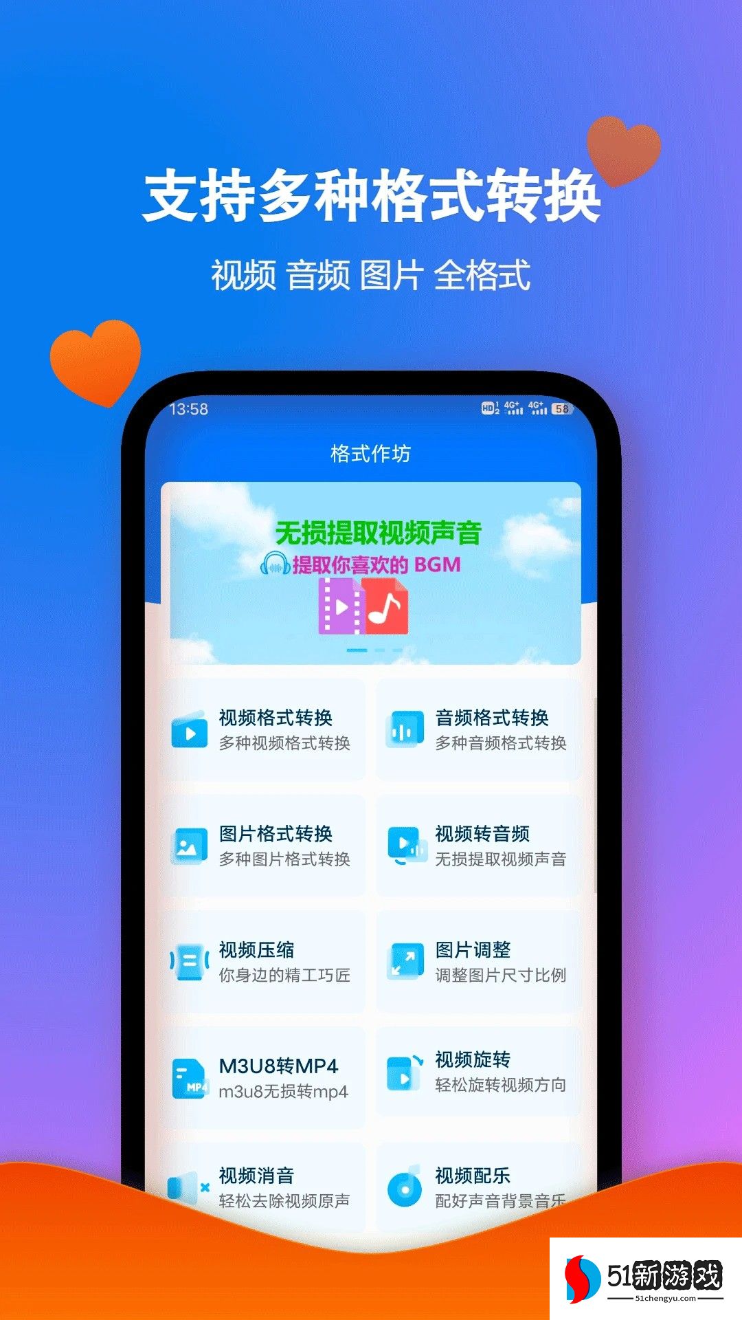 格式作坊是一款非常实用的手机工具箱,拥有丰富的功能选项,可以让用户自由选择各种格式进行转换操作,自由享受优质的服务,还支持无损音频提取、视频压缩等,随时随地自由选择使用,轻松体验便携的操作,还具有个性化的界面设计,无需任何经验即可上手使用,方便用户自由管理各种格式的文件并保存,能完全满足所有使用需求,还提供在线客服功能,轻松帮助用户解决各种格式问题,有需要的用户欢迎来本站下载软件。