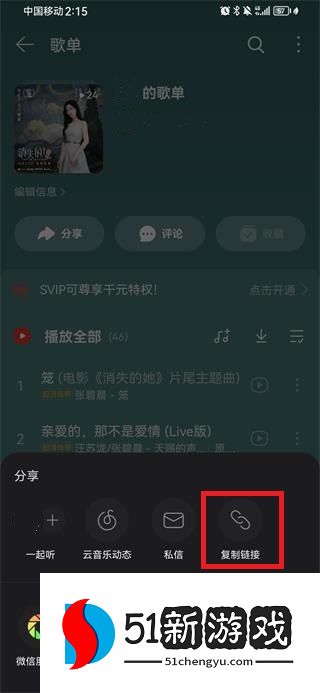 3、如果您打开网易云或其他音乐应用程序,请选择播放列表,单击“共享”,然后复制链接。