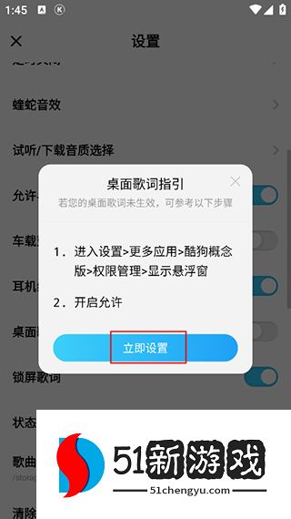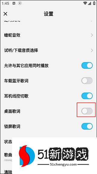 3、进入到设置页面,向下滑动屏幕找到“桌面歌词”选项,点击右侧的开关按钮。