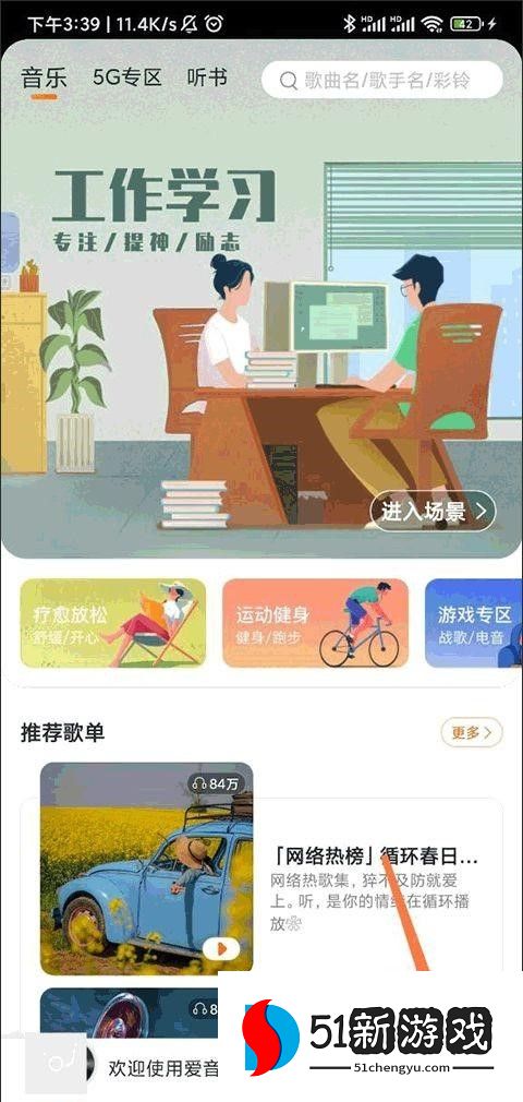 1、首先,打开爱音乐应用程序的官方版本,在主页上,一些播放列表将根据您的收听偏好智能推送给您。