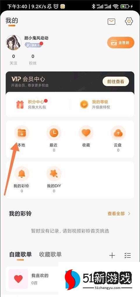 3、在您的个人页面上选择“本地”选项,您将被带到本地音乐管理界面,首次使用时可能不会显示手机中的音乐文件。