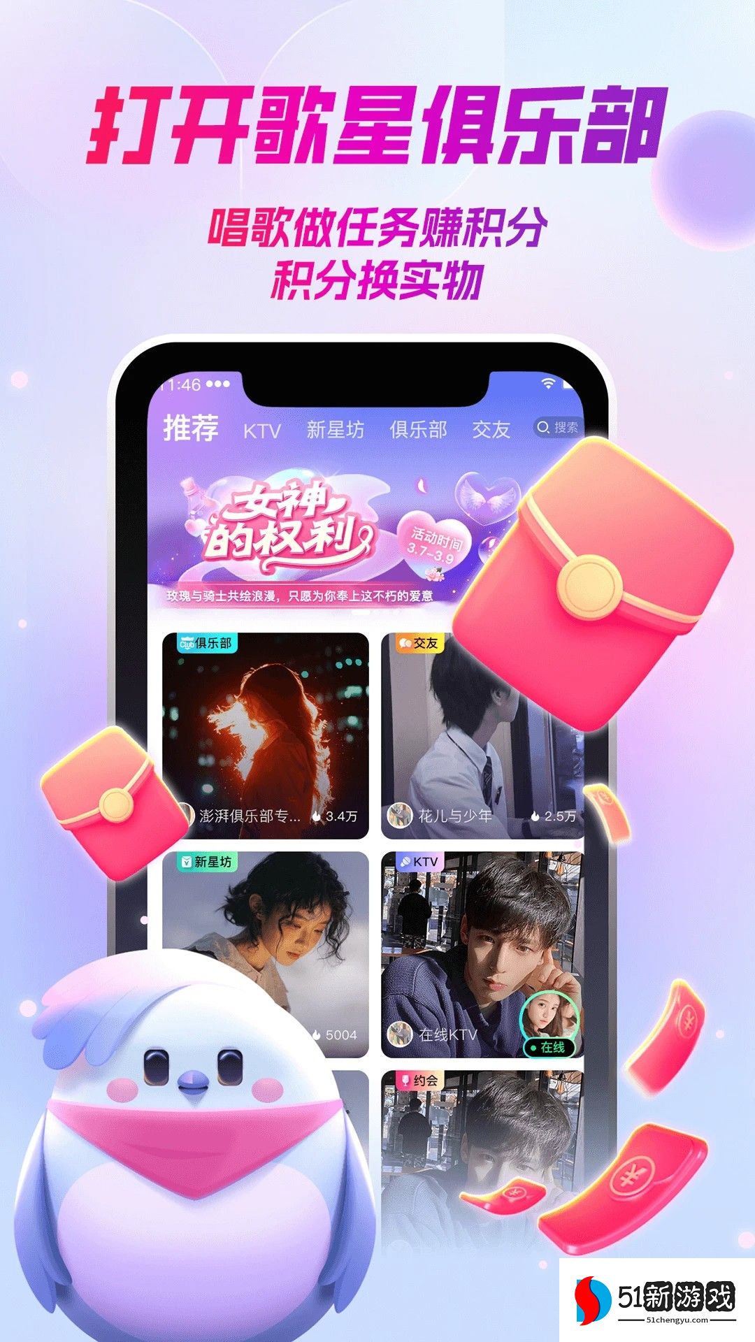 歌星俱乐部是一款受欢迎的唱歌K歌软件,拥有丰富的音乐歌曲资源可以自由选择,随时随地轻松浏览查看热门音乐歌曲,轻松找到许多热门音乐来唱歌,自由享受优质的服务,还能自由加入各种唱歌俱乐部,体验有趣的唱歌活动来参与,自由获得丰富的奖励,给用户带来全面的乐趣,还为用户提供创造各种游戏玩法,可以轻松进入直播来演唱各种音乐歌曲并在线互动,能完全满足所有使用需求,有需要的用户欢迎来本站下载软件。