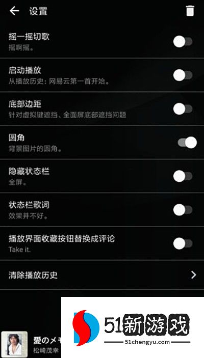 4、进入设置页面后,用户还可以尝试打开“摇一摇切歌”、“状态栏歌词”、“底部边距”等服务,以获得更好的播放体验。