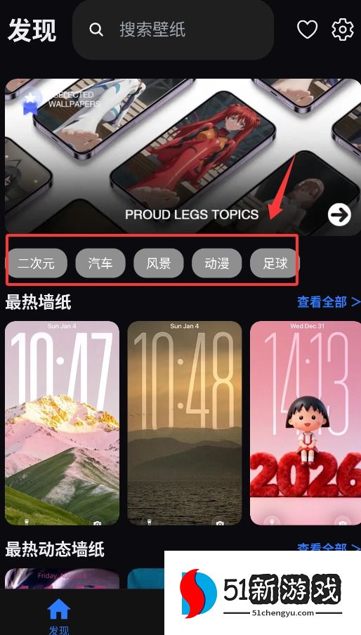2、发现界面包括动漫、汽车、风景、动漫、足球等内容类别。