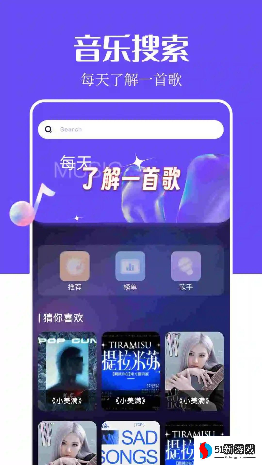 音乐搜索是一款高人气的在线音乐播放软件,拥有庞大的音乐库,可以在里面自由浏览查看热门音乐歌曲,还提供强大的音乐搜索方式,随时随地快速搜索查找感兴趣的音乐,自由享受优质的音乐播放服务,还具有流畅播放模式和选择,轻松选择各种感兴趣的音乐来听,能完全满足所有音乐需求,还提供高质量的音乐歌曲榜单,及时关注最新且受欢迎的音乐,方便用户免费听歌播放,有需要的用户欢迎来本站下载软件。