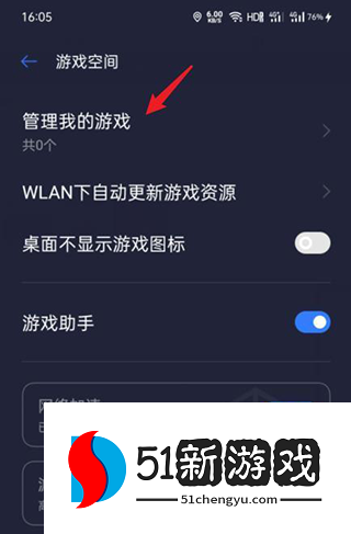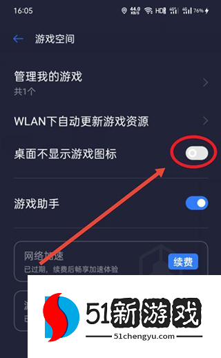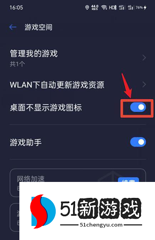 5、添加后,在游戏空间界面,点击桌面不显示游戏图标的开关;