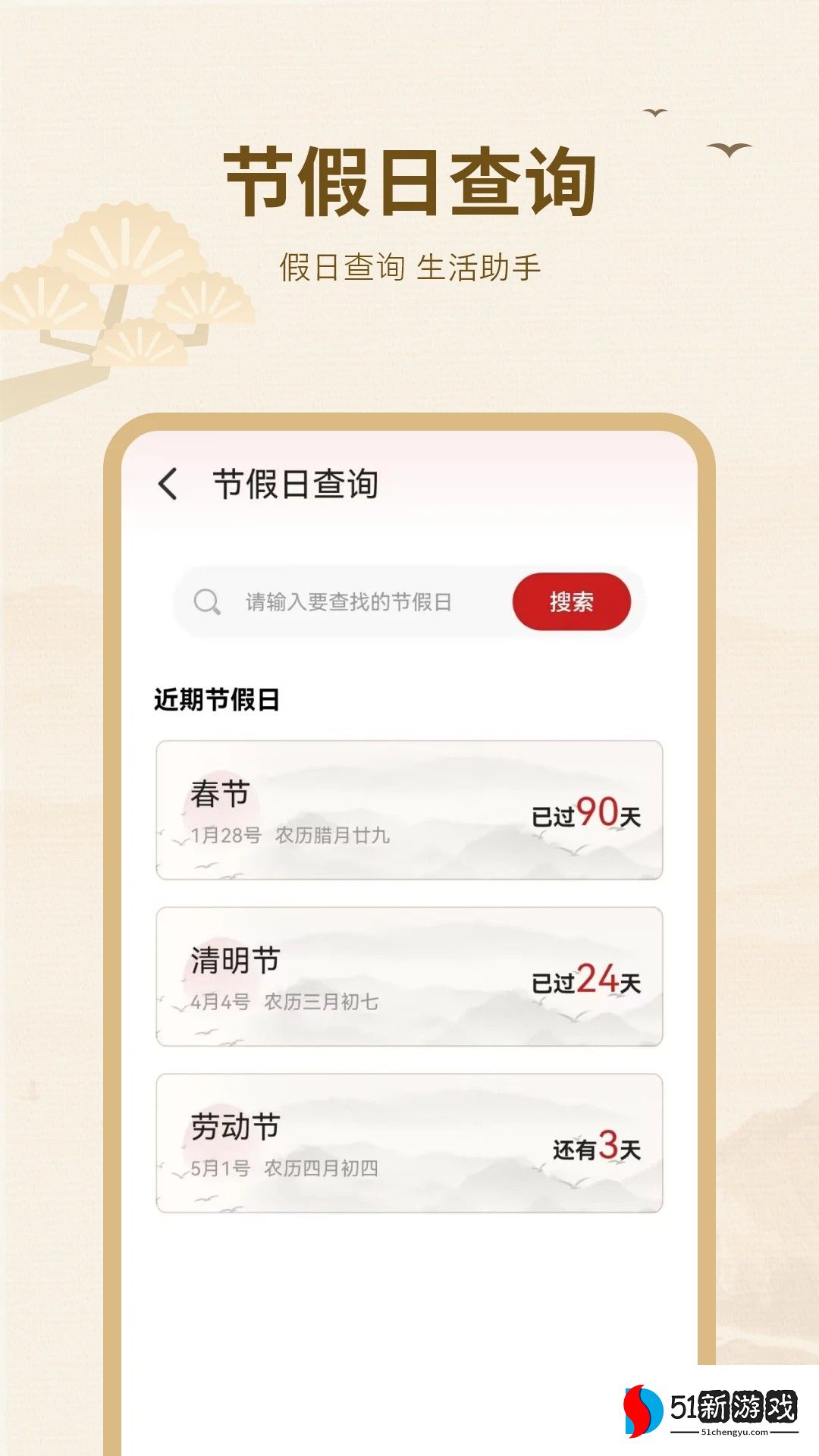 4、历史年历查询:支持查询过去某一天的年历信息,方便用户查看历史日期
