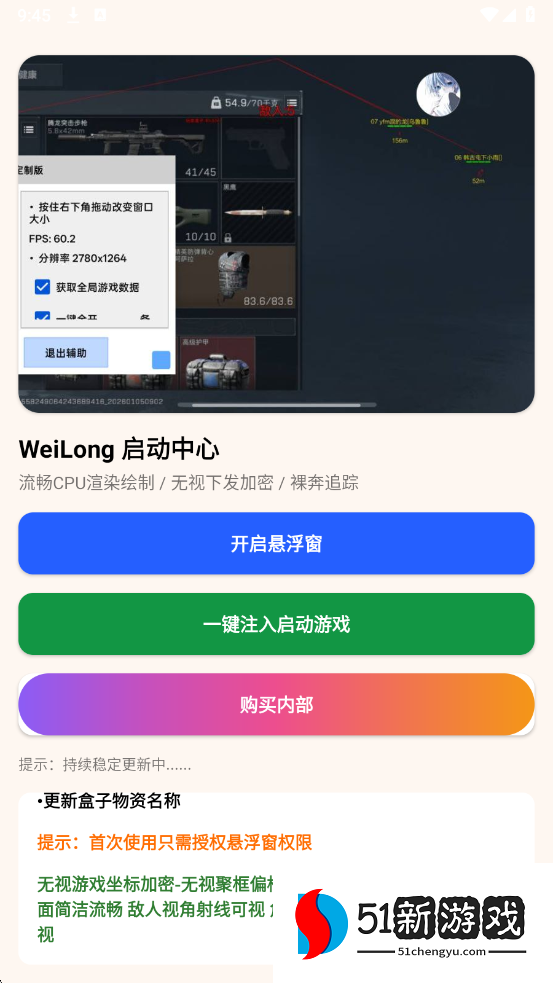 威龙漏打直装是一款专门为游戏而打造的辅助工具神器,为每个人提供了一个无root运行环境,以进行各种修改和帮助。用户下载威龙漏打直装安装后,可以直接点击使用,使用时,您可以体验地图信息查看、战术策略参考和实际数据辅助等功能。使用前,您需要在系统设置中启用“允许在其他应用程序上显示”权限,这非常方便使用,而且功能十分强大,可以让你在游戏中轻松成为大神!