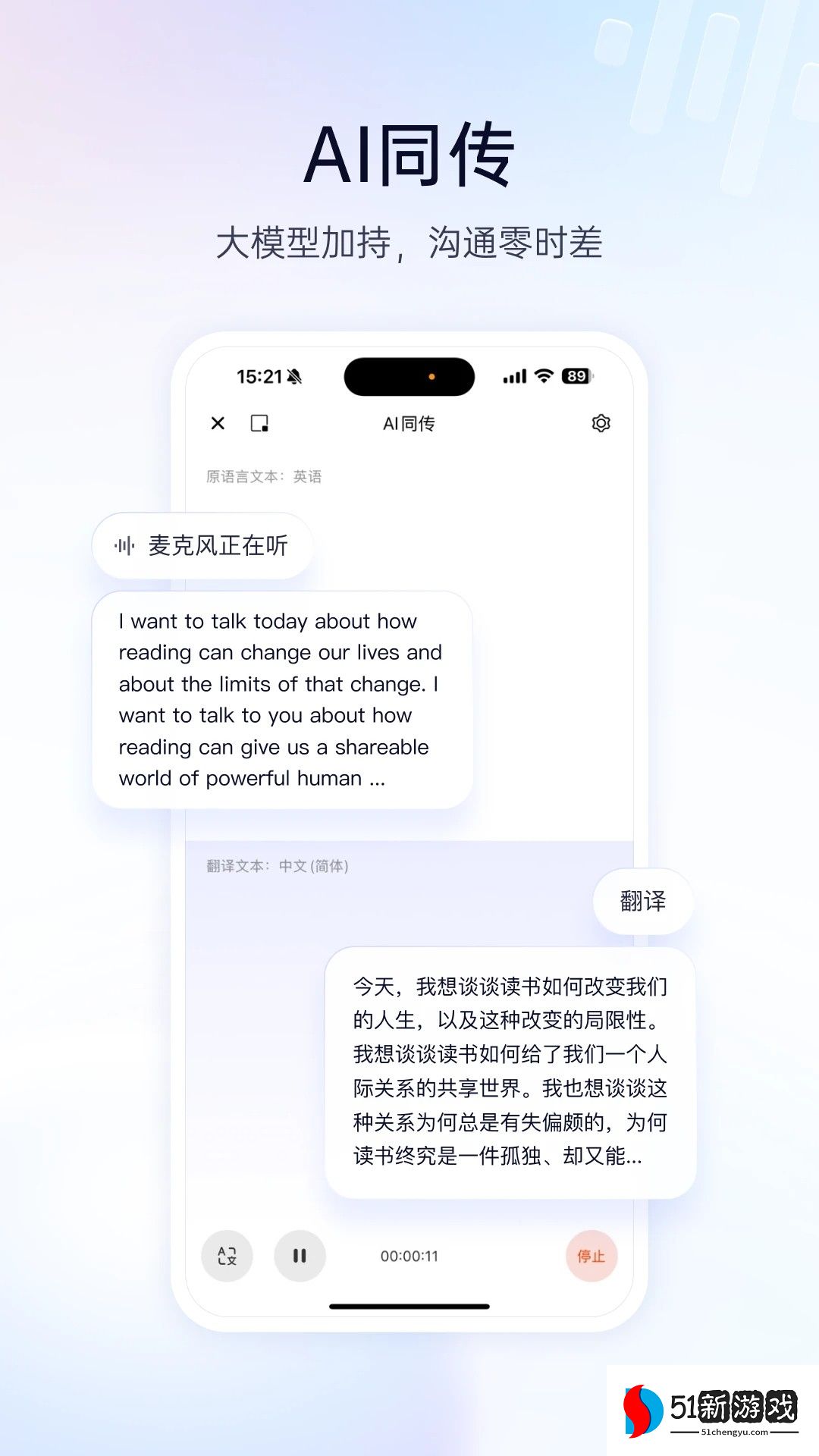 2、语音翻译:支持实时语音翻译,使用户无需输入文本即可实现与外国人的无障碍交流。