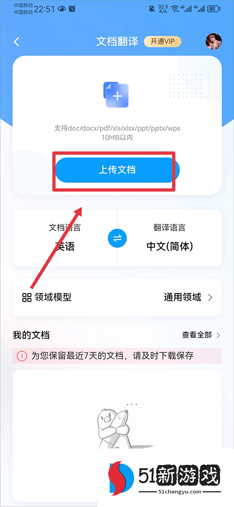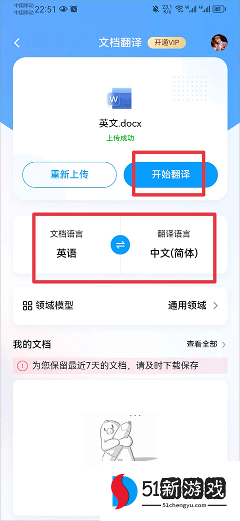 4、文档上传成功后,选择文档语言和翻译语言,点击开始翻译。