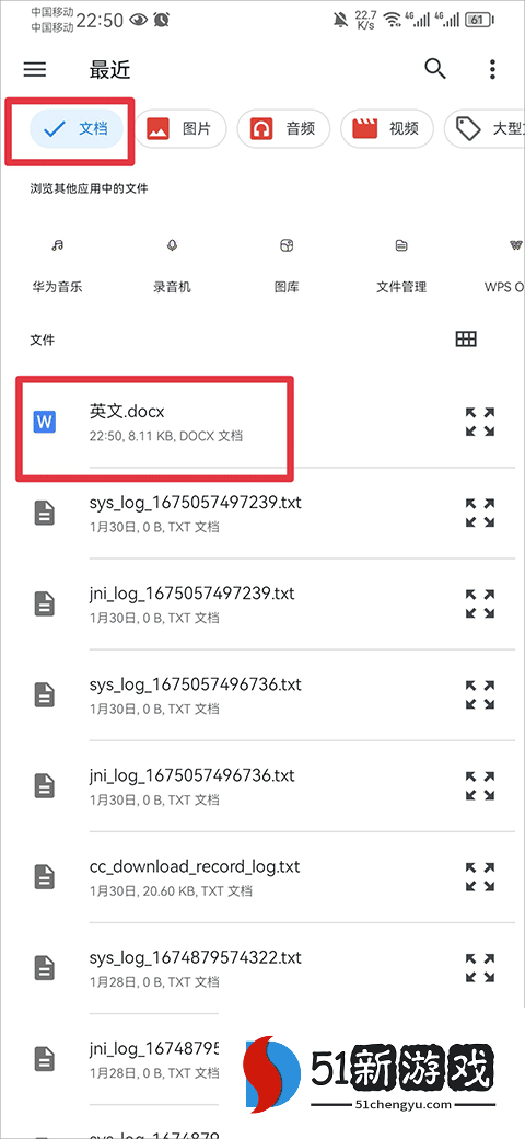 3、然后点击手机文件中的文档,在文档界面中选择要上传的文档。