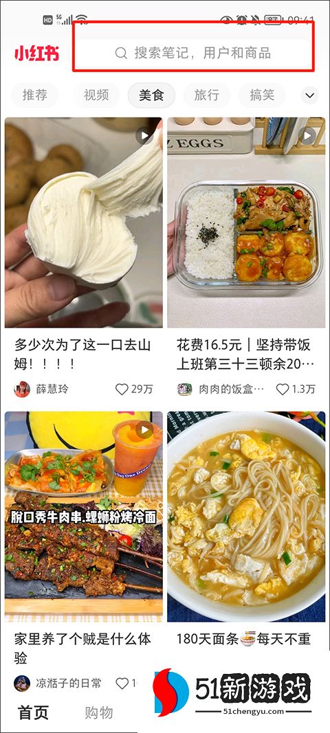 2、进入到软件后,可以选择上面的美食,进入到美食页面,就可以看到很多的美食分享,也可以选择右上角来搜索你想了解的美食。