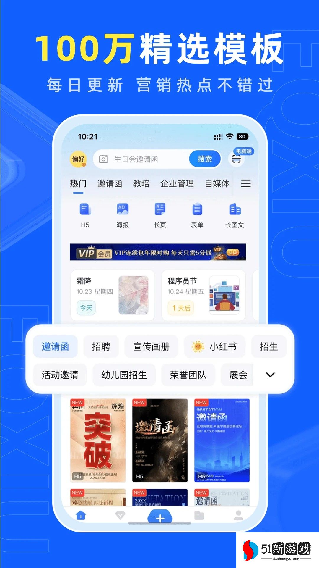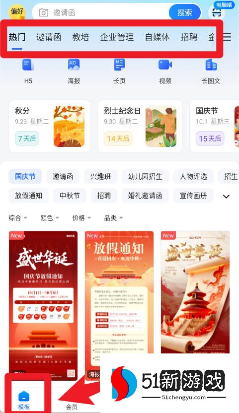 2、主页汇集了邀请函、企业管理、自媒体、招聘等类别,可以快速找到所需的模板。