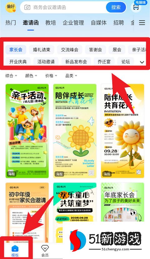 3、在模板类别中,可以选择婚礼邀请函、家长会、感谢活动、论坛等主题模板,以便在不同场景中轻松应用。