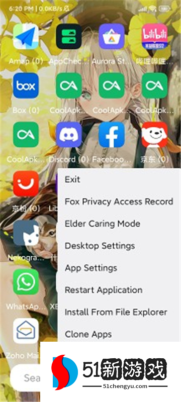 1、界面和操作:安装后,打开Fuxi X,界面类似于新系统,背景是手机系统壁纸,图标是已拆分的软件。用户可以通过右下角的菜单从文件管理器中选择克隆应用程序或安装apk文件。