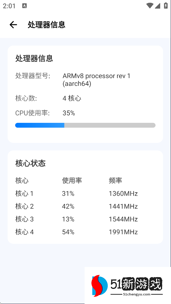 显示CPU核心负载、内存占用、电池电量及存储空间。