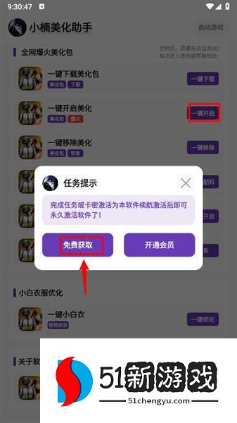 5、例如可以点击“一键开启美化”开关,在弹窗中点击“免费获取”。
