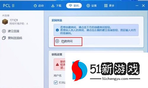 6、打开pcl2启动器,点击顶部的联机频道然后点击右侧【创建房间】。
