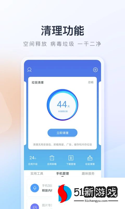 1、一键加速:智能清理手机内存,关闭空闲后台进程,提高手机运行速度。