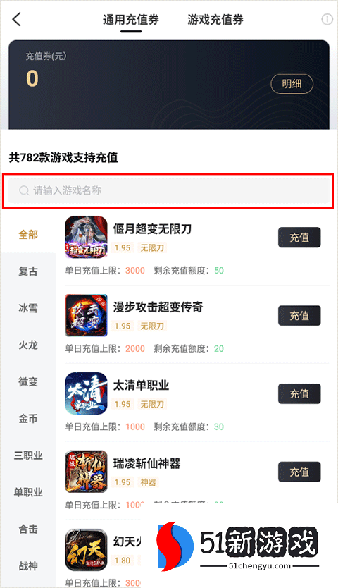 2、搜索你需要充值的游戏,也可以通过分类进行查找。