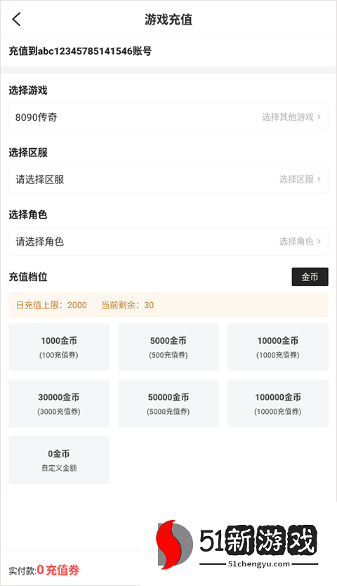 3、找到后选择游戏区服等,充值额度,点击充值即可。