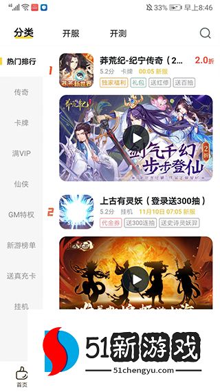 3、进入【分类】界面,包括传奇、卡牌、满VIP、仙侠、GM特权、开服、开测等丰富的游戏分类,玩家可以自行选择搜索感兴趣的游戏,我们以【上古有灵妖】为例。
