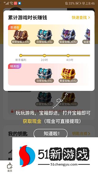 5、进入【赚现金】界面,我们可以通过玩游戏累计时长来获取宝箱,打开宝箱后可以获得现金奖励。