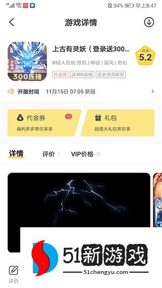 4、进入游戏详情界面,滑动屏幕我们可以了解游戏的介绍、评价、开服时间等信息,也可以领取代金券、礼包等福利,最后只需点击下载安装就可以体验了。