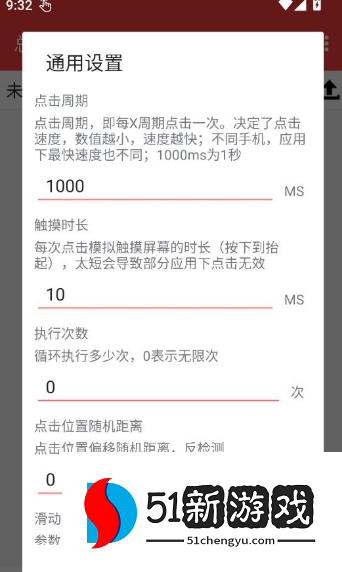 2、可以微调点击核心参数,包括点击周期、触摸持续时间、执行次数、点击位置的随机距离和滚动持续时间。
