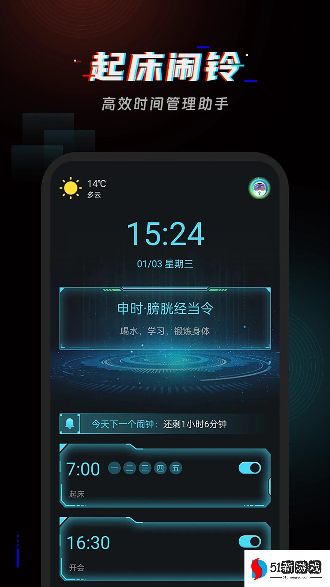 1、设置闹钟:进入应用程序后,用户可以自由添加闹钟,设置响铃时间、铃声、挑战任务等。