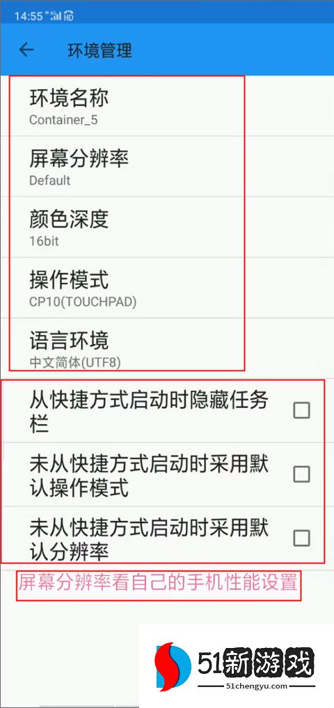 4、下面就是要设置一下参数,像屏幕分辨率、颜色深度、操作模式等,屏幕分辨率是看自己手机性能设置的。