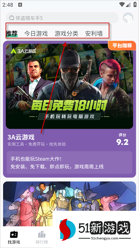 2、进入首页,通过今日推荐、热门分类、安利墙等板块筛选游戏;也可进入游戏排行榜查看热门或高分游戏;还能在游戏分类模块按类型查找游戏。