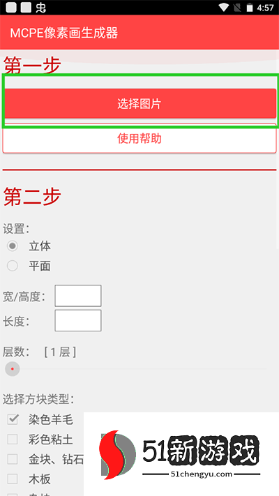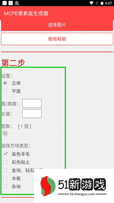 2、其次选择要立体还是平面,然后在输入宽/高度和长度,目前最大尺寸为512,请记住,一个minecraft PE的世界高度是为128块方块所以在选择立体生成的时候宽/高度不能够超过128,然后在设置好像素画的层数目前最大层数为16层。建议尺寸最大不要超过300,层数最多选择6层,因为尺寸和层数越大生成的时间就越久。