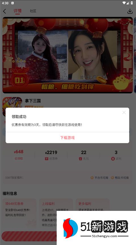 3387手游折扣平台app收集了大量优质手机游戏,可享受0.1折扣。新用户一上线就可以获得 648 张免费退款优惠券,享受丰厚的礼物包和折扣活动。该平台提供各种流行游戏资源,包括各种类型的游戏,如角色扮演、冒险和策略,让您轻松找到喜欢的游戏。社区部分还提供详细的策略和互动功能,让玩家更容易分享体验。您不仅可以尝试最新的游戏,还可以通过每日登录和其他活动获得额外奖励,让您的游戏之旅更加有趣。