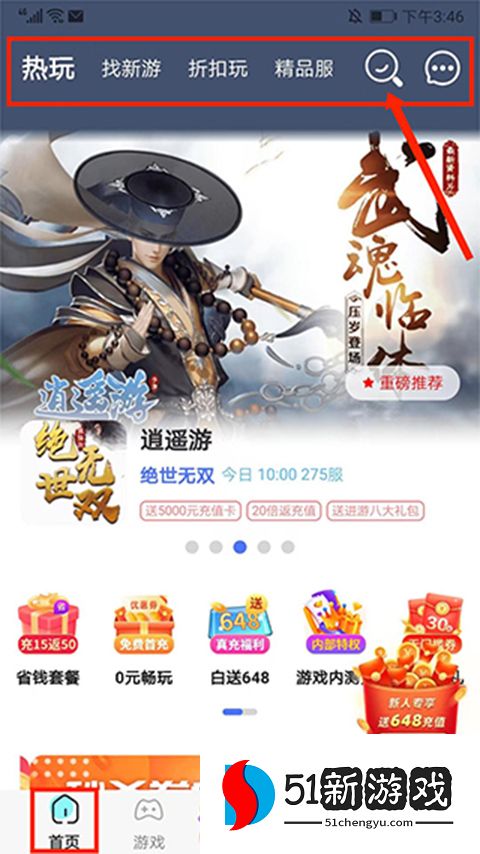 2、进入应用首页,将游戏分为“热玩”、“找新游”、“折扣玩”、“精品服”和“搜索”五大类,用户根据自己的需求选择即可,这里以搜索为例,选择“放大镜”图标。