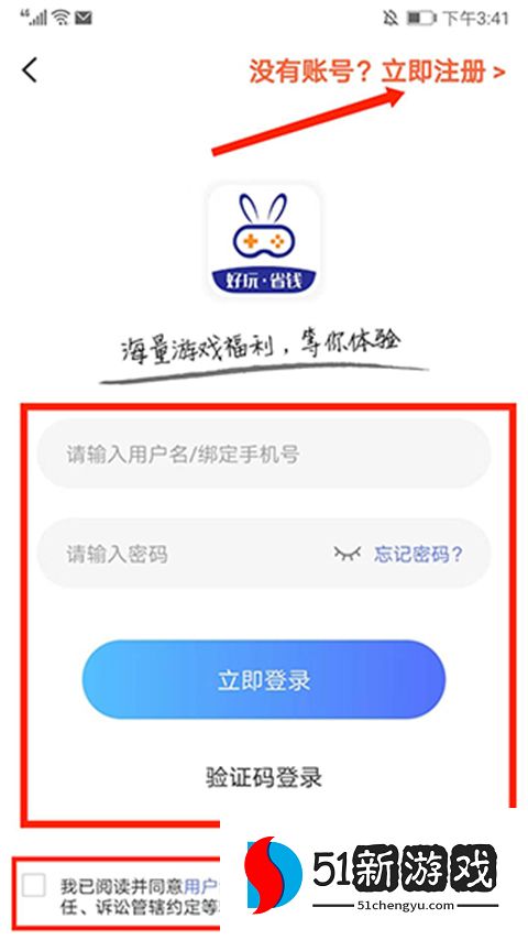 1、打开app,如果有账号可以选择账号或者验证码登录,没有账号可以选择右上角“立即注册”后,勾选左下角条款,进行登录。