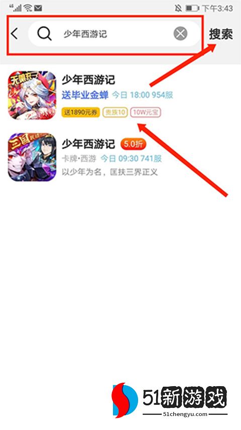 3、在“搜索框”输入想了解或者感兴趣的游戏,进行搜索,这里以“少年西游记”为例。