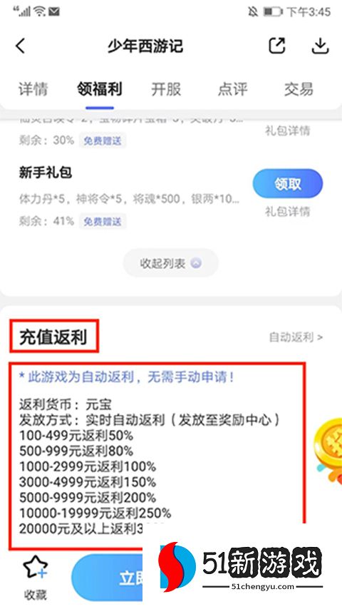 1、往下滑动,进入【充值返利】栏目,可了解详细的返利货币、发放方式以及返利比例。