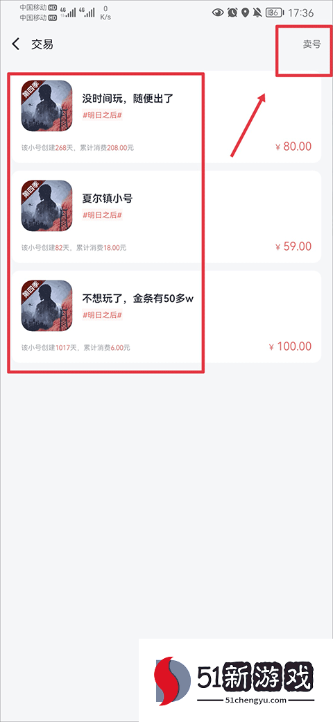 3、然后用户可以在这里进行购买其他玩家出售的账号,也可以点击右上角卖号来出售自己的游戏账号。
