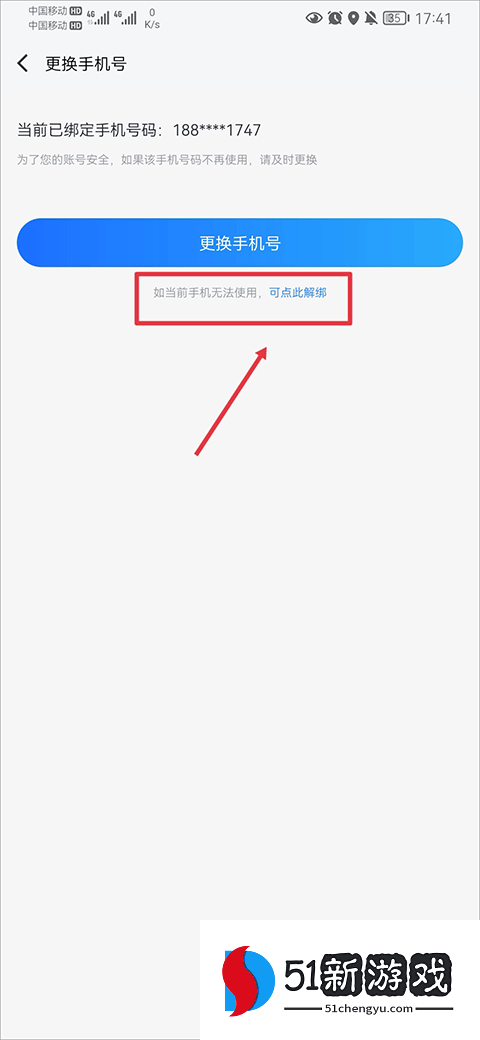 3、然后在更换手机号下方,点击若当前手机无法使用,可点此解绑。