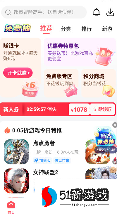 1、打开软件,在软件首页有不少推荐的游戏,也可以在分类按类型找喜欢的游戏,或者顶部搜索框中输入关键词找游戏。