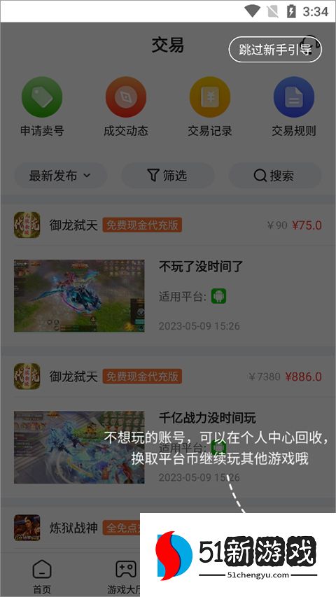 2、不想玩的账号可以在个人中心进行回收来换取平台金币就可以玩游戏。