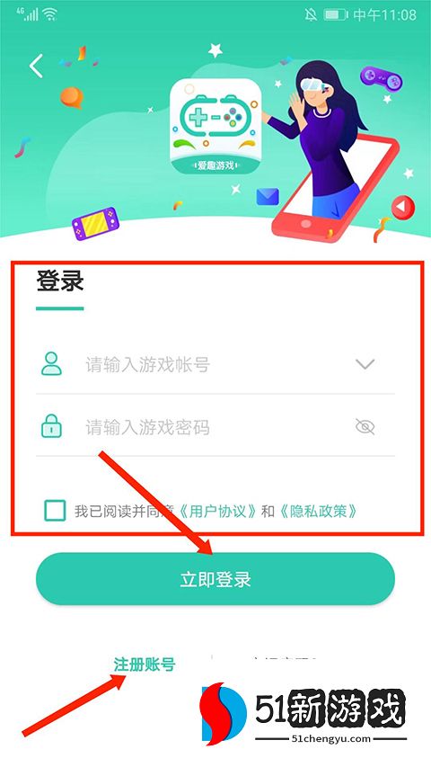 1、app,进入【登录】界面,填写好游戏账号和密码后,选择“立即登录”即可,新用户选择“注册账号”,再进行登录就可以了。