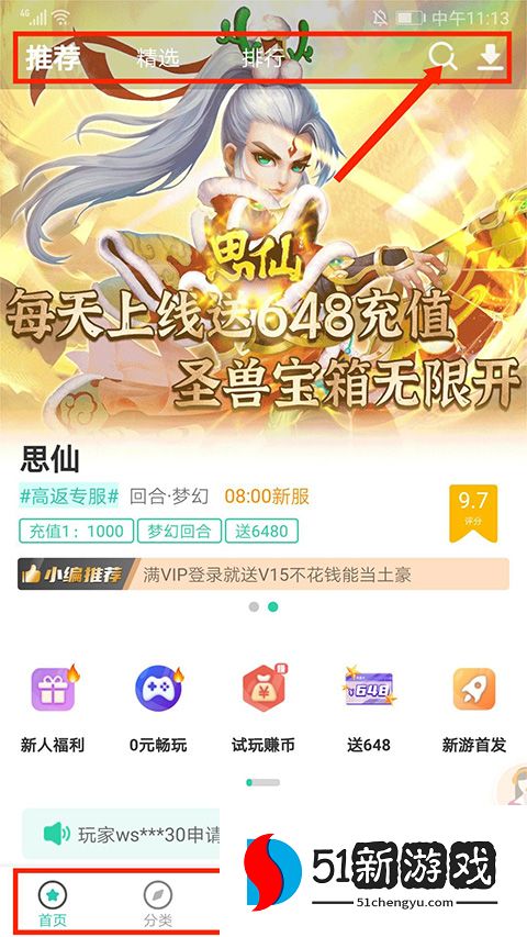 2、进入应用界面,包括【首页】、【分类】、【福利中心】、【交易】和【我的】栏目,在【首页】界面将游戏分为“推荐”、“精选”、“排行”和“搜索”,这里以“搜索”为例,选择右上角“放大镜”图标。