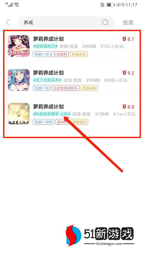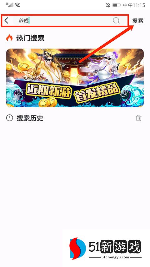 3、进入【搜索】界面,在“搜索框”输入想玩的游戏,然后选择“搜索”选项即可,这里以“养成”为例。