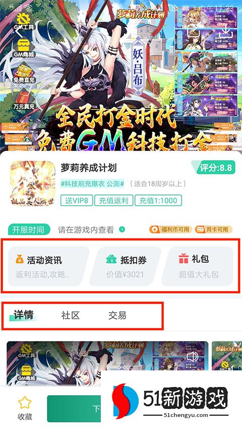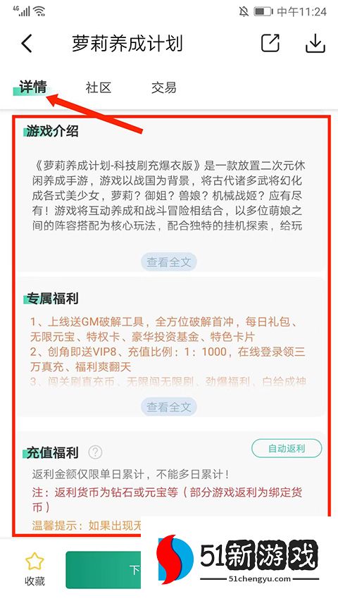 3、在【详情】界面,可看到“游戏介绍”、“专属福利”、“充值福利”等内容,可以更好的了解游戏内容和折扣福利。