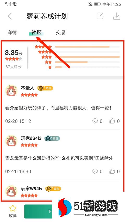 4、在【社区】界面,可看到真实玩家的留言分享,交流游戏心得。