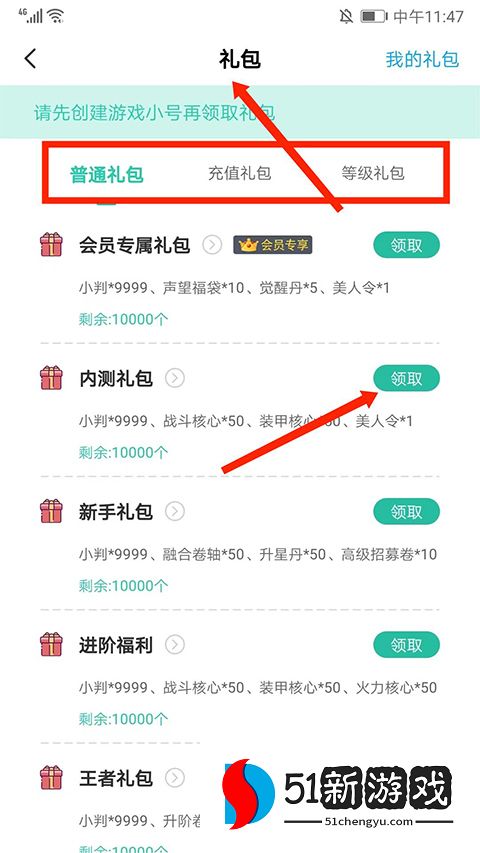 7、在【礼包】界面,可选择“普通礼包”、“充值礼包”、“等级礼包”进行领取,助你游戏更轻松。